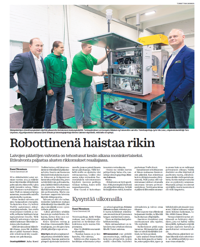 Viime kesänä valvonta otti aimo harppauksen eteenpäin. Turkulainen Kine Oy kehitti Trafille uudenlaisen etävalvontajärjestelmän. Sen avulla viranomaiset tietävät jo merellä, millaisia hiukkasia laivat tuprauttelevat ilmoille.